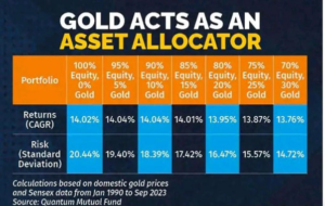 In fact, in volatile conditions, where equities may plummet by 10% and bonds might drop by 2%, a portfolio without gold could see a 7.4% decline. However, by reallocating a portion to gold, say 10%, the impact of volatility can be mitigated. For instance, if during the same period, gold prices rise by 5%—a plausible scenario during economic downturns—the portfolio’s overall loss can be reduced to 6.45%.