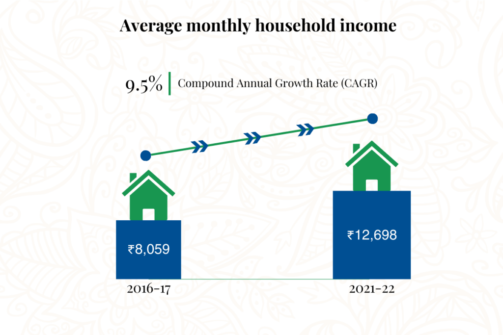 The NABARD All India Financial Inclusion Survey (NAFIS), released in October 2024, reveals critical insights into rural economic trends. Between 2016-17 and 2021-22, average monthly household incomes surged from ₹8,059 in 2016-17 to ₹12,698, reflecting a compound annual growth rate (CAGR) of 9.5%. This income growth has empowered households to save more, with the percentage of families reporting regular savings increasing from 50.6% to 65.6% during this period.