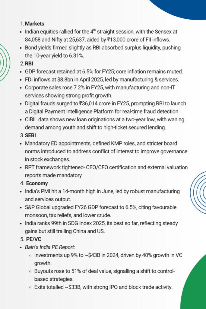 Indian equities advanced for the fourth consecutive session on Friday, buoyed by strong foreign institutional investor (FII) inflows, broad-based blue-chip buying, a strengthening rupee, and a sharp decline in global crude oil prices. The Sensex closed at 84,058 and the Nifty at 25,637, as both indices edged closer to record highs. Despite over ₹1 lakh crore worth of stake sales by promoters, PE/VCs, and strategic investors in the last two months—adding supply pressure—net FII inflows of ₹13,000 crore last week have underpinned the rally. While improving sentiment and declining crude prices indicate potential for further upside, the sustainability of market momentum will hinge on the corporate earnings trajectory.